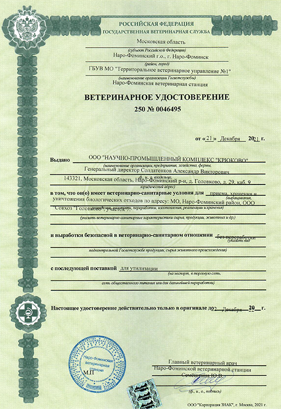 Предприятие имеет разрешение (ветеринарное удостоверение) на приём, хранение и уничтожение биологических отходов № 250 0046495 от 21 декабря 2021 г. Соблюдены все ветеринарно-санитарные требования, площадка имеет подтверждённый статус в ИС «Цербер» Номер предприятия в реестре: RU4639310. Номер предприятия в ИС «Цербер»: RU050:19765124.